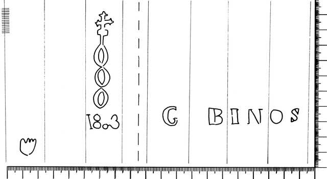 Tipo de filigrana: Doble Parte estudiada: Izquierda Código del Motivo: U.03.03.02 Descripción: Filigrana doble. Filigrana izquierda: tres círculos, con trazado doble, surmontados por una cruz lobulada y en la base 1803, en la parte inferior izquierda contramarca con forma de flor (tulipán?). Filigrana derecha: las letras G BINOS. Estructura: Tradicional de líneas Altura (mm): 95 Anchura (mm): 66 Tipo de papel: Verjurado Posición en la hoja: Izquierda centro Nº de corondeles en la hoja: 16 Distancia entre corondeles: Situada entre el corondel 2 y el corondel 5 Posición en relación al texto: Origen de los datos: Datos obtenidos del original País de localizatión del molino: Francia Lugar del molino: Auch, Béarn. Fabricante: G. Binos Autor de los datos de este registro: María Dolores Díaz de Miranda Macías y Ana María Herrero Montero Tipo de uso: Papel para escribir Estado de la hoja: Cortados todos los bordes Altura de la hoja: 291 Anchura de la hoja: 408 Color de la hoja: Natural Estado de conservación: Restaurado Información adicional: El color de la hoja, Natural, no ha sufrido ninguna manipulación para cambiar sustancialmente el color natural de las fibras celulósicas; el leve lejiado de las fibras en la elaboración de la pulpa de papel lo consideramos una operación dentro del proceso de elaboración del papel. Institución: Archivo Municipal de Oviedo.