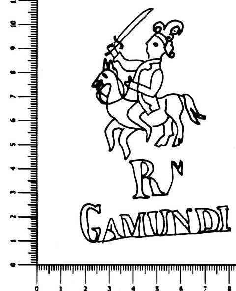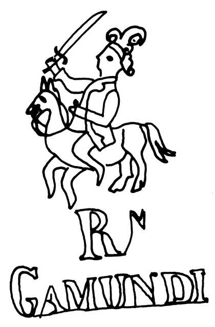 Tipo de filigrana: Sencilla Parte estudiada: Toda la filigrana Código del Motivo: A.01.08.01 Descripción: Jinete a caballo con espada alzada en la mano derecha , a los pies RN / GAMUNDI. Estructura: Tradicional de líneas Altura (mm): 96 Anchura (mm): 63 Tipo de papel: Vitela Posición en la hoja: Derecha centro Distancia entre corondeles: Posición en relación al texto: Origen de los datos: Datos obtenidos del original País de localizatión del molino: España Fabricante: Ramón Gamundi Autor de los datos de este registro: María Dolores Díaz de Miranda Macías y Ana María Herrero Montero Tipo de uso: Papel para escribir Estado de la hoja: Cortados todos los bordes Altura de la hoja: 300 Anchura de la hoja: 404 Color de la hoja: Natural Institución: Archivo Municipal de Oviedo.