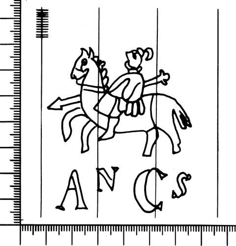 Tipo de filigrana: Sencilla Parte estudiada: Toda la filigrana Código del Motivo: A.01.08.02 Descripción: Rejoneador a caballo con lanza en la mano derecha y a los pies las iniciales AN CS . Estructura: Tradicional de líneas Altura (mm): 65 Anchura (mm): 56 Tipo de papel: Verjurado Posición en la hoja: Izquierda centro Nº de corondeles en la hoja: 10 Distancia entre corondeles: Situada entre el corondel 3 y el corondel 6 Posición en relación al texto: Origen de los datos: Lugar del molino: Segovia. Fabricante: Andrés Casaban Autor de los datos de este registro: María Dolores Díaz de Miranda Macías Estado de la hoja: Cortado borde derecho y superior Altura de la hoja: 309 Anchura de la hoja: 200 Color de la hoja: Natural Institución: Archivo Municipal de Oviedo.