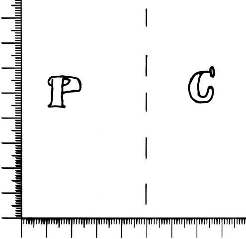 Tipo de filigrana: Doble Parte estudiada: Derecha Código del Motivo: V.02.01.00 Descripción: Filigrana doble. Filigrana izquierda: letra P. Filigrana derecha: letra C. Estructura: Tradicional de líneas Altura (mm): 15 Anchura (mm): 11 Tipo de papel: Continuo Posición en la hoja: Derecha inferior Distancia entre corondeles: Posición en relación al texto: Perpendicular al texto hacia abajo Origen de los datos: Datos obtenidos del original País de localizatión del molino: España Lugar del molino: Cataluña Fabricante: Pau o Pere Costas Autor de los datos de este registro: María Dolores Díaz de Miranda Macías Estado de la hoja: Cortados todos los bordes Altura de la hoja: 308 Anchura de la hoja: 420 Color de la hoja: Natural Estado de conservación: Bueno Institución: Archivo Municipal de Oviedo.