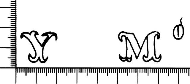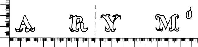 Tipo de filigrana: Doble Parte estudiada: Derecha Código del Motivo: V.02.01.00 Descripción: Filigrana izquierda: letras A R. Filigrana derecha: letras Y MO. Estructura: Tradicional de líneas Altura (mm): 22 Anchura (mm): 80 Tipo de papel: Vitela Posición en la hoja: Derecha inferior Distancia entre corondeles: Posición en relación al texto: Origen de los datos: Datos obtenidos del original País de localizatión del molino: España Lugar del molino: Capellades, Barcelona ? Fabricante: Antonio Romaní y Miró Autor de los datos de este registro: María Dolores Díaz de Miranda Macías Estado de la hoja: Cortado borde izquierdo e inferior Altura de la hoja: 312 Anchura de la hoja: 430 Color de la hoja: Natural Institución: Archivo Municipal de Oviedo.