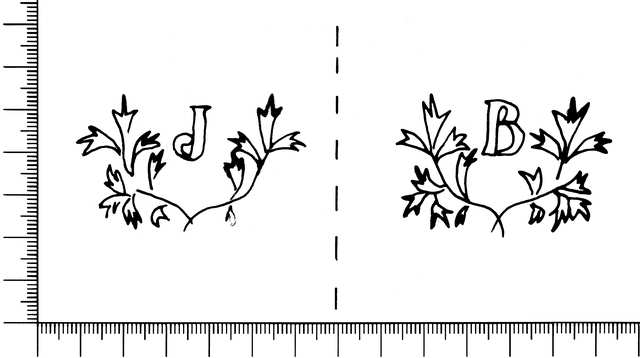 Tipo de filigrana: Doble Parte estudiada: Izquierda Código del Motivo: V.02.02.00 Descripción: Filigrana izquierda: Letras J entre vegetales. Filigrana derecha: Letras B entre vegetales. Estructura: Tradicional de líneas Altura (mm): 34 Anchura (mm): 55 Tipo de papel: Continuo Posición en la hoja: Izquierda inferior Distancia entre corondeles: Posición en relación al texto: Perpendicular al texto hacia arriba Origen de los datos: Datos obtenidos del original País de localizatión del molino: España Autor de los datos de este registro: María Dolores Díaz de Miranda Macías Estado de la hoja: Cortado borde derecho e inferior Altura de la hoja: 312 Anchura de la hoja: 430 Color de la hoja: Natural Institución: Archivo Municipal de Oviedo.
