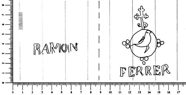 Tipo de filigrana: Doble Parte estudiada: Derecha Código del Motivo: D.03.02.00 Descripción: Filigrana izquierda: RAMON. Filigrana derecha: Paloma dentro de un círculo surmontado por una cruz lobulada y en la base FERRER. Estructura: Tradicional de líneas Altura (mm): 72 Anchura (mm): 51 Tipo de papel: Verjurado Posición en la hoja: Derecha centro Distancia entre corondeles: Distancia media entre 22 y 23. Situada entre el corondel 12 y el corondel 15 Posición en relación al texto: Origen de los datos: Datos obtenidos del original País de localizatión del molino: España Lugar del molino: La Riba, Tarragona. Fabricante: Ramon Ferrer Estado de la hoja: Cortados todos los bordes Altura de la hoja: 293 Anchura de la hoja: 410 Color de la hoja: Natural Institución: Archivo Municipal de Oviedo.