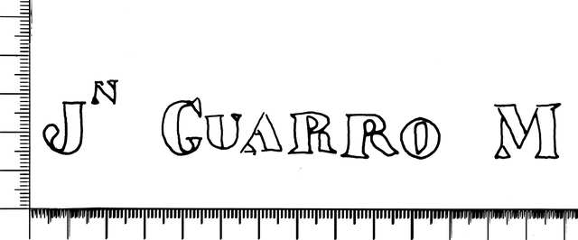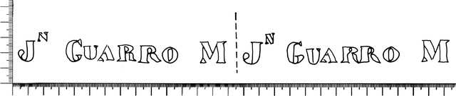 Tipo de filigrana: Doble Parte estudiada: Izquierda Código del Motivo: W.04.02.00 Descripción: Filigrna izquierda: las letras JN GUARRO M. Filigrana derecha: igual que la izquierda. Estructura: Tradicional de líneas Altura (mm): 20 Anchura (mm): 135 Tipo de papel: Vitela Posición en la hoja: Izquierda inferior Distancia entre corondeles: Posición en relación al texto: Origen de los datos: Datos obtenidos del original País de localizatión del molino: España Lugar del molino: Cataluña Fabricante: Juan Guarro M Autor de los datos de este registro: María Dolores Díaz de Miranda Macías Estado de la hoja: Sin cortar bordes Altura de la hoja: 315 Anchura de la hoja: 430 Color de la hoja: Natural Institución: Archivo Municipal de Oviedo.
