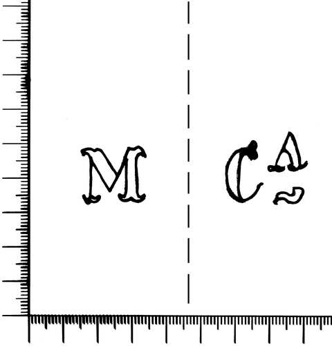 Tipo de filigrana: Doble Parte estudiada: Derecha Código del Motivo: V.03.00.00 Descripción: Filigrana izquierda: letra M. Filigrana derecha: letras CA. Estructura: Tradicional de líneas Altura (mm): 21 Anchura (mm): 24 Tipo de papel: Continuo Posición en la hoja: Derecha inferior Distancia entre corondeles: Posición en relación al texto: Perpendicular al texto hacia arriba Origen de los datos: Datos obtenidos del original País de localizatión del molino: España Lugar del molino: Cataluña Autor de los datos de este registro: María Dolores Díaz de Miranda Macías Estado de la hoja: Sin cortar bordes Altura de la hoja: 315 Anchura de la hoja: 434 Color de la hoja: Natural Estado de conservación: Bueno Institución: Archivo Municipal de Oviedo.
