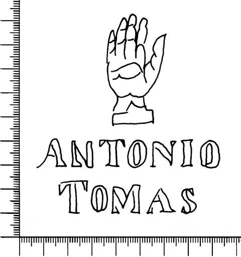Tipo de filigrana: Sencilla Parte estudiada: Toda la filigrana Código del Motivo: B.06.01.00 Descripción: Mano abierta en la base las letras ANTONIO/TOMAS. Estructura: Tradicional de líneas Altura (mm): 83 Anchura (mm): 76 Tipo de papel: Vitela Posición en la hoja: Derecha centro Distancia entre corondeles: Posición en relación al texto: Origen de los datos: Datos obtenidos del original País de localizatión del molino: España Lugar del molino: La Riba, Tarragona. Fabricante: Antonio Tomás Autor de los datos de este registro: María Dolores Díaz de Miranda Macías Estado de la hoja: Sin cortar bordes Altura de la hoja: 315 Anchura de la hoja: 438 Color de la hoja: Natural Institución: Archivo Municipal de Oviedo.