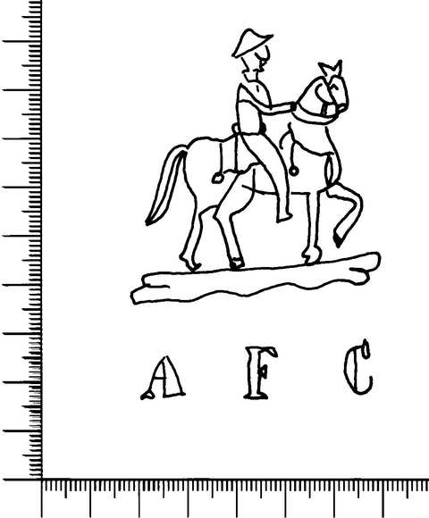 Tipo de filigrana: Sencilla Parte estudiada: Toda la filigrana Código del Motivo: A.01.08.01 Descripción: Soldado de caballería a caballo, en la base las iniciales AFC. Estructura: Tradicional de líneas Altura (mm): 76 Anchura (mm): 50 Tipo de papel: Vitela Posición en la hoja: Derecha centro Distancia entre corondeles: Posición en relación al texto: Origen de los datos: Datos obtenidos del original País de localizatión del molino: España Fabricante: A.F.C. Autor de los datos de este registro: María Dolores Díaz de Miranda Macías Estado de la hoja: Sin cortar bordes Altura de la hoja: 312 Anchura de la hoja: 432 Color de la hoja: Natural Institución: Archivo Municipal de Oviedo.