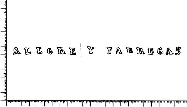 Tipo de filigrana: Doble Parte estudiada: Izquierda Código del Motivo: W.02.01.00 Descripción: Filigrana izquierda: las letras ALEGRE Y FABREGAS. Filigrana derecha igual que la izquierda. Estructura: Tradicional de líneas Altura (mm): 9 Anchura (mm): 82 Tipo de papel: Continuo Posición en la hoja: Izquierda inferior Distancia entre corondeles: Posición en relación al texto: Perpendicular al texto hacia abajo Origen de los datos: Datos obtenidos del original País de localizatión del molino: España Lugar del molino: Cataluña Fabricante: Alegre y Fabregas Autor de los datos de este registro: María Dolores Díaz de Miranda Macías Estado de la hoja: Sin cortar bordes Altura de la hoja: 311 Anchura de la hoja: 432 Color de la hoja: Natural Estado de conservación: Bueno Institución: Archivo Municipal de Oviedo.