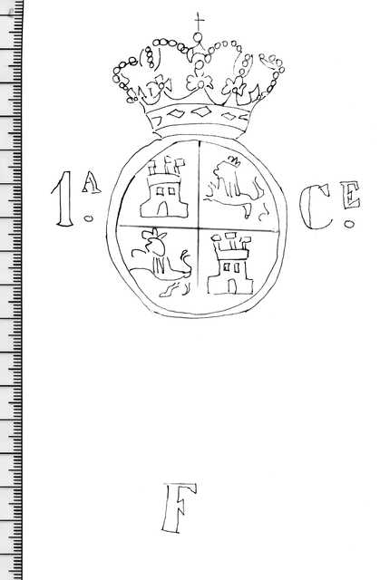 Tipo de filigrana: Doble Parte estudiada: Izquierda Código del Motivo: T.04.01.01 Descripción: Filigrana doble. Escudo de España costeado por 1A. CE. a ambos lados del pliego del papel. Debajo, la contramarca FV. Estructura: Tradicional de líneas Altura (mm): 154 Anchura (mm): 92 Tipo de papel: Continuo Posición en la hoja: Izquierda centro Distancia entre corondeles: Posición en relación al texto: Perpendicular al texto hacia arriba Origen de los datos: Datos obtenidos del original País de localizatión del molino: España Lugar del molino: Cataluña Autor de los datos de este registro: María Dolores Díaz de Miranda Macías Estado de la hoja: Cortado borde superior Altura de la hoja: 310 Anchura de la hoja: 430 Color de la hoja: Natural Estado de conservación: Bueno Institución: Archivo Municipal de Oviedo.