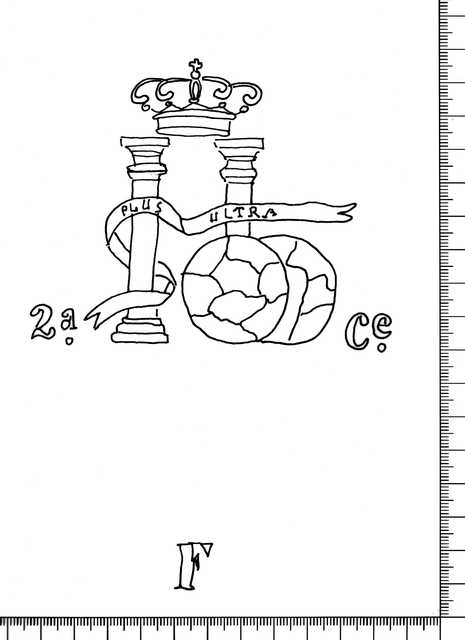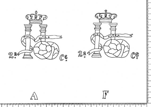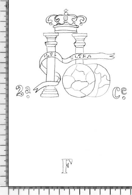 Tipo de filigrana: Doble Parte estudiada: Derecha Código del Motivo: K.03.04.01 Descripción: Filigrana izquierda: columnas de Hércules, cinta con leyenda PLUS ULTRA. Delante, dos esferas. Franqueada a izquierda y derecha por 2A. CE. Abajo la inicial A (contramarca) . Filigrana derecha: idéntica a la anterior pero en la parte inferior la inicial F Estructura: Tradicional de líneas Altura (mm): 100 Anchura (mm): 160 Tipo de papel: Continuo Posición en la hoja: Derecha centro Distancia entre corondeles: Posición en relación al texto: Perpendicular al texto hacia arriba Origen de los datos: Datos obtenidos del original País de localizatión del molino: España Lugar del molino: Cataluña Autor de los datos de este registro: María Dolores Díaz de Miranda Macías Estado de la hoja: Sin cortar bordes Altura de la hoja: 311 Anchura de la hoja: 444 Color de la hoja: Natural Estado de conservación: Bueno Institución: Archivo Municipal de Oviedo.