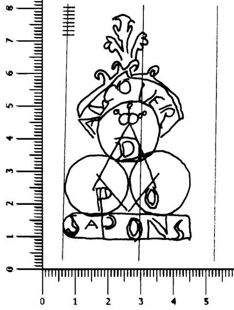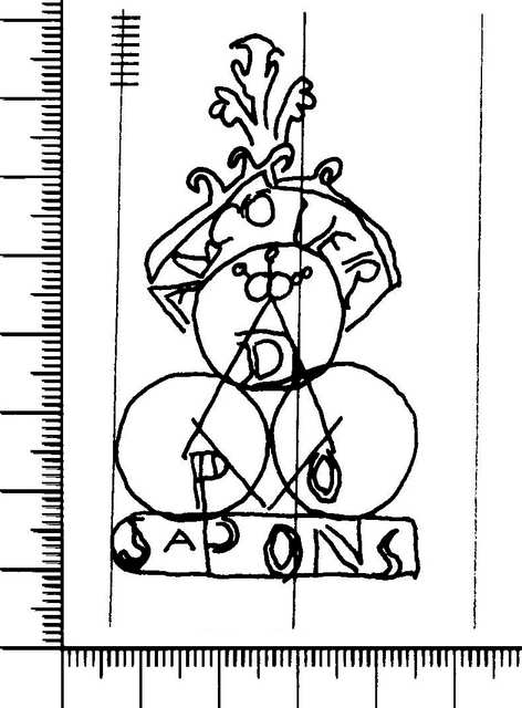 Tipo de filigrana: Sencilla Parte estudiada: Toda la filigrana Código del Motivo: U.05.00.00 Descripción: Tres círculos formando un triángulo y letras en su interior D / P / O, en la parte superior cartela con las letras ALCOVER y en la base las letras JA PONS. Estructura: Tradicional de líneas Altura (mm): 70 Anchura (mm): 40 Tipo de papel: Verjurado Posición en la hoja: Derecha centro Nº de corondeles en la hoja: 19 Distancia entre corondeles: Situada entre el corondel 14 y el corondel 16 Posición en relación al texto: Origen de los datos: Datos obtenidos del original País de localizatión del molino: España Lugar del molino: Alcover, Tarragona. Fabricante: Jaume Pons Autor de los datos de este registro: María Dolores Díaz de Miranda Macías Tipo de uso: Papel para escribir Estado de la hoja: Cortados todos los bordes Altura de la hoja: 308 Anchura de la hoja: 420 Color de la hoja: Natural Institución: Archivo Municipal de Oviedo.