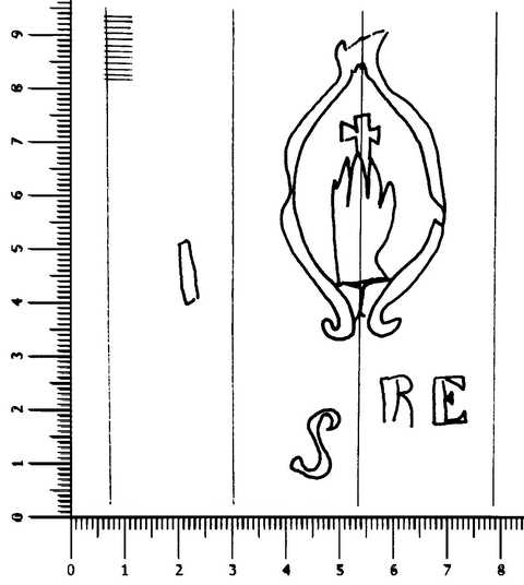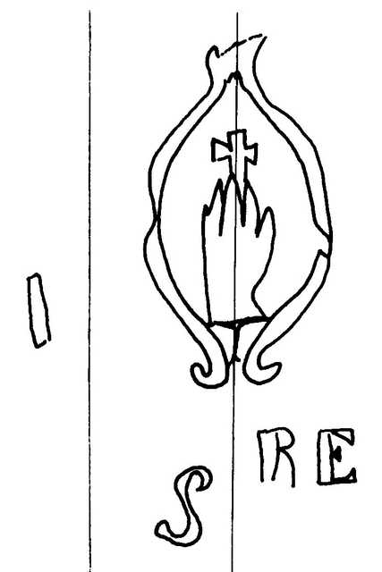 Tipo de filigrana: Sencilla Parte estudiada: Toda la filigrana Código del Motivo: T.02.01.99 Descripción: Orla almendrada; en el interior una mano surmontada por una cruz; a la izquierda la letra I y en la base las letras SER. Estructura: Tradicional de líneas Altura (mm): 85 Anchura (mm): 51 Tipo de papel: Verjurado Posición en la hoja: Medio centro Nº de corondeles en la hoja: 10 Distancia entre corondeles: Situada entre el corondel 3 y el corondel 6 Posición en relación al texto: Origen de los datos: Datos obtenidos del original País de localizatión del molino: España Lugar del molino: Els Algars, Concentaina, Alicante. Fabricante: Miguel Sempere Autor de los datos de este registro: María Dolores Díaz de Miranda Macías Tipo de uso: Papel sellado Estado de la hoja: Cortados todos los bordes Altura de la hoja: 309 Anchura de la hoja: 215 Color de la hoja: Natural Institución: Archivo Municipal de Oviedo.
