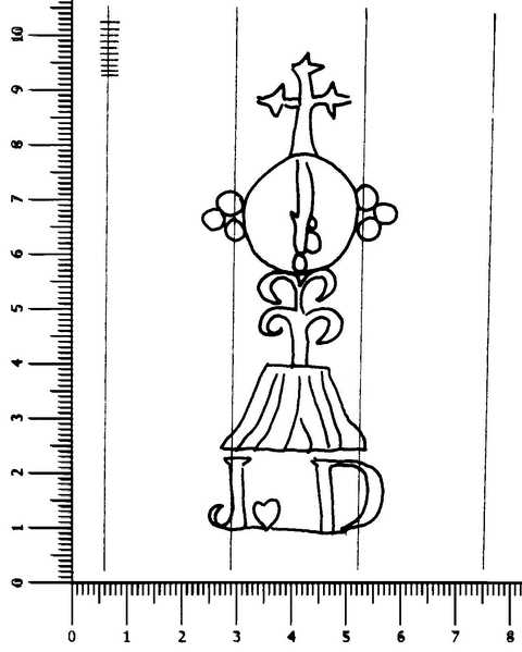 Tipo de filigrana: Sencilla Parte estudiada: Toda la filigrana Código del Motivo: S.15.01.01 Descripción: Custodia en el interior una espada (puñal) y en la base la letra J, un pequeño corazón, y la letra D. Estructura: Tradicional de líneas Altura (mm): 88 Anchura (mm): 36 Tipo de papel: Verjurado Posición en la hoja: Medio centro Nº de corondeles en la hoja: 10 Distancia entre corondeles: Situada entre el corondel 4 y el corondel 7 Posición en relación al texto: Origen de los datos: Datos obtenidos del original País de localizatión del molino: España Lugar del molino: Sant Joan les Fonts, Gerona. Fabricante: Jacint Domènec Autor de los datos de este registro: María Dolores Díaz de Miranda Macías Tipo de uso: Papel sellado Estado de la hoja: Cortado borde inferior Altura de la hoja: 308 Anchura de la hoja: 215 Color de la hoja: Natural Institución: Archivo Municipal de Oviedo.