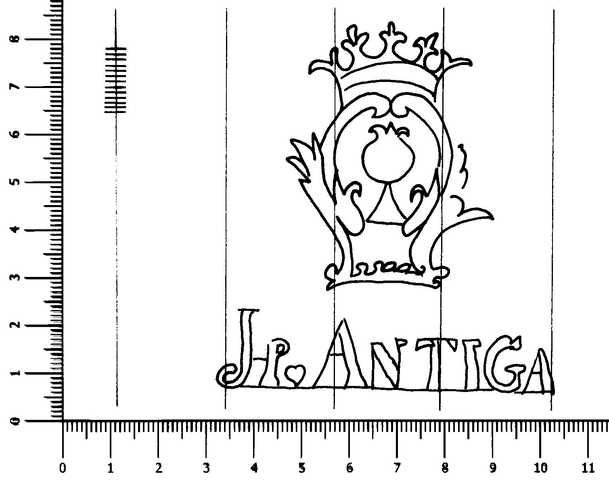 Tipo de filigrana: Sencilla Parte estudiada: Toda la filigrana Código del Motivo: T.02.04.04 Descripción: Escudo coronado con granada en el interior, a los pies JP ANTIGA. Estructura: Tradicional de líneas Altura (mm): 78 Anchura (mm): 72 Tipo de papel: Verjurado Posición en la hoja: Derecha centro Nº de corondeles en la hoja: 19 Distancia entre corondeles: Situada entre el corondel 12 y el corondel 17 Posición en relación al texto: Origen de los datos: Datos obtenidos del original País de localizatión del molino: España Lugar del molino: Sant Joan les Fonts, Gerona. Fabricante: Josep Antiga Autor de los datos de este registro: María Dolores Díaz de Miranda Macías Tipo de uso: Papel sellado Estado de la hoja: Sin cortar bordes Altura de la hoja: 313 Anchura de la hoja: 444 Color de la hoja: Natural Institución: Archivo Municipal de Oviedo.