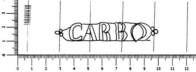 Tipo de filigrana: Sencilla Parte estudiada: Toda la filigrana Código del Motivo: W.02.03.00 Descripción: Letras CARBO dentro de cartela. Estructura: Tradicional de líneas Altura (mm): 14 Anchura (mm): 73 Tipo de papel: Verjurado Posición en la hoja: Izquierda centro Nº de corondeles en la hoja: 19 Distancia entre corondeles: Situada entre el corondel 3 y el corondel 8 Posición en relación al texto: Origen de los datos: Datos obtenidos del original País de localizatión del molino: España Lugar del molino: La Riba, Tarragona. Fabricante: Carbó Autor de los datos de este registro: María Dolores Díaz de Miranda Macías Tipo de uso: Papel sellado Estado de la hoja: Sin cortar bordes Altura de la hoja: 306 Anchura de la hoja: 430 Color de la hoja: Natural Institución: Archivo Municipal de Oviedo.