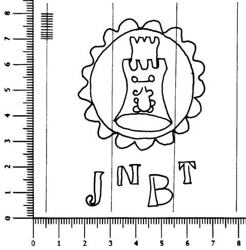 Tipo de filigrana: Sencilla Parte estudiada: Toda la filigrana Código del Motivo: K.02.01.05 Descripción: Torre del homenaje o donjonada dentro de un círculo orlado, en la base las iniciales JN BT. Estructura: Tradicional de líneas Altura (mm): 74 Anchura (mm): 50 Tipo de papel: Verjurado Posición en la hoja: Derecha centro Nº de corondeles en la hoja: 19 Distancia entre corondeles: Situada entre el corondel 13 y el corondel 16 Posición en relación al texto: Origen de los datos: Datos obtenidos del original País de localizatión del molino: España Lugar del molino: Bocairent, Valencia Fabricante: Juan Boronat Autor de los datos de este registro: María Dolores Díaz de Miranda Macías Tipo de uso: Papel sellado Estado de la hoja: Cortado borde izquierdo e inferior Altura de la hoja: 317 Anchura de la hoja: 444 Color de la hoja: Natural Institución: Archivo Municipal de Oviedo.