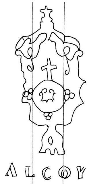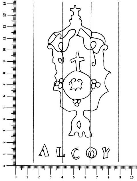 Tipo de filigrana: Doble Parte estudiada: Derecha Código del Motivo: T.02.15.01 Descripción: Filigrana doble. Filigrana izquierda: To ABAD. Filigrana derecha: escudo con un círculo surmontado por una cruz en su interior, en la base el topónimo ALCOY. Estructura: Tradicional de líneas Altura (mm): 134 Anchura (mm): 64 Tipo de papel: Verjurado Posición en la hoja: Derecha centro Nº de corondeles en la hoja: 19 Distancia entre corondeles: Situada entre el corondel 13 y el corondel 16 Posición en relación al texto: Origen de los datos: Datos obtenidos del original País de localizatión del molino: España Lugar del molino: Alcoy, Alicante. Fabricante: Tadeo Abad Autor de los datos de este registro: María Dolores Díaz de Miranda Macías Tipo de uso: Papel sellado Estado de la hoja: Cortados todos los bordes Altura de la hoja: 314 Anchura de la hoja: 444 Color de la hoja: Natural Institución: Archivo Municipal de Oviedo.