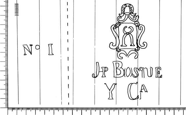 Tipo de filigrana: Doble Parte estudiada: Derecha Código del Motivo: T.02.10.03 Descripción: Filigrana doble. Filigrana izquierda: Nº I. Filigrana derecha: escudo en el interior las tijeras de tundir, en la base JP BOSQUE Y CA. Estructura: Tradicional de líneas Altura (mm): 105 Anchura (mm): 76 Tipo de papel: Verjurado Posición en la hoja: Derecha centro Nº de corondeles en la hoja: 19 Distancia entre corondeles: Situada entre el corondel 12 y el corondel 17 Posición en relación al texto: Origen de los datos: Datos obtenidos del original País de localizatión del molino: España Lugar del molino: La Torre de Claramunt, Barcelona. Fabricante: Josep Bosque/Bosquet/Busquet y compañía Autor de los datos de este registro: María Dolores Díaz de Miranda Macías Tipo de uso: Papel sellado Estado de la hoja: Cortado borde superior e inferior Altura de la hoja: 315 Anchura de la hoja: 430 Color de la hoja: Natural Institución: Archivo Municipal de Oviedo.