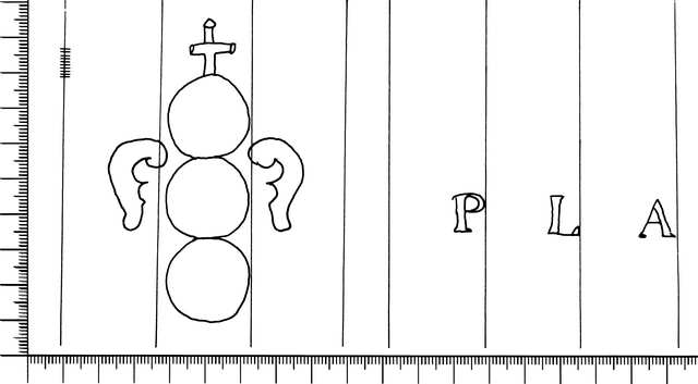 Tipo de filigrana: Doble Parte estudiada: Izquierda Código del Motivo: U.03.03.12 Descripción: Filigrana doble. Filigrana izquierda: tres círculos surmontados por una cruz y a mano derecha e izquierda un ala. Filigrana derecha: las letras PLA. Estructura: Tradicional de líneas Altura (mm): 86 Anchura (mm): 55 Tipo de papel: Verjurado Posición en la hoja: Izquierda centro Nº de corondeles en la hoja: 17 Distancia entre corondeles: Situada entre el corondel 3 y el corondel 6 Posición en relación al texto: Origen de los datos: Datos obtenidos del original Fabricante: PLA Autor de los datos de este registro: María Dolores Díaz de Miranda Macías Tipo de uso: Papel para escribir Estado de la hoja: Cortados todos los bordes Altura de la hoja: 298 Anchura de la hoja: 405 Color de la hoja: Natural Institución: Archivo Municipal de Oviedo.