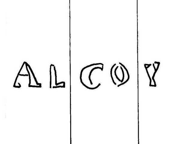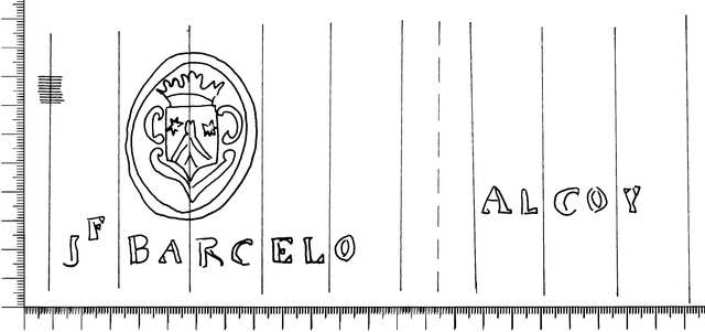 Tipo de filigrana: Doble Parte estudiada: Derecha Código del Motivo: W.03.00.00 Descripción: Filigrana doble. Filigrana izquierda: óvalo con el escudo de la Merced y en la base JF BARCELO. Filigrana derecha: topónimo ALCOY. Estructura: Tradicional de líneas Altura (mm): 10 Anchura (mm): 55 Tipo de papel: Verjurado Posición en la hoja: Derecha centro Nº de corondeles en la hoja: 19 Distancia entre corondeles: Situada entre el corondel 3 y el corondel 8 Posición en relación al texto: Origen de los datos: Datos obtenidos del original País de localizatión del molino: España Lugar del molino: Alcoy, Alicante. Fabricante: José Barceló Autor de los datos de este registro: María Dolores Díaz de Miranda Macías Tipo de uso: Papel sellado Estado de la hoja: Cortados todos los bordes Altura de la hoja: 314 Anchura de la hoja: 435 Color de la hoja: Natural Institución: Archivo Municipal de Oviedo.