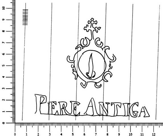 Tipo de filigrana: Sencilla Parte estudiada: Toda la filigrana Código del Motivo: T.02.09.01 Descripción: Relicario con espada (puñal) en su interior, coronado por una cruz y en la base PERE ANTIGA. Estructura: Tradicional de líneas Altura (mm): 87 Anchura (mm): 99 Tipo de papel: Verjurado Posición en la hoja: Derecha centro Nº de corondeles en la hoja: 19 Distancia entre corondeles: Situada entre el corondel 12 y el corondel 17 Posición en relación al texto: Origen de los datos: Datos obtenidos del original País de localizatión del molino: España Lugar del molino: Sant Joan les Fonts, Gerona. Nombre del molino: Ca Sarjant Fabricante: Pere Antiga Autor de los datos de este registro: María Dolores Díaz de Miranda Macías Tipo de uso: Papel sellado Estado de la hoja: Cortados todos los bordes Altura de la hoja: 290 Anchura de la hoja: 420 Color de la hoja: Natural Institución: Archivo Municipal de Oviedo.