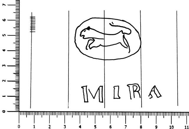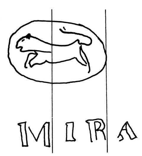 Tipo de filigrana: Sencilla Parte estudiada: Toda la filigrana Código del Motivo: C.04.03.00 Descripción: Círculo con animal cuadrúpedo corriendo en el interior y en la base MIRA. Estructura: Tradicional de líneas Altura (mm): 56 Anchura (mm): 57 Tipo de papel: Verjurado Posición en la hoja: Derecha centro Nº de corondeles en la hoja: 19 Distancia entre corondeles: Situada entre el corondel 13 y el corondel 16 Posición en relación al texto: Origen de los datos: Datos obtenidos del original País de localizatión del molino: España Lugar del molino: Alcoy, Alicante. Fabricante: Francisco Mira Autor de los datos de este registro: María Dolores Díaz de Miranda Macías Tipo de uso: Papel sellado Estado de la hoja: Cortados todos los bordes Altura de la hoja: 301 Anchura de la hoja: 432 Color de la hoja: Natural Institución: Archivo Municipal de Oviedo.