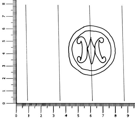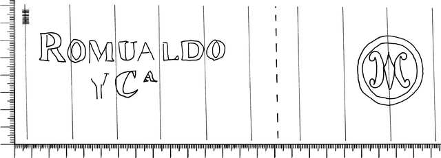 Tipo de filigrana: Doble Parte estudiada: Derecha Código del Motivo: S.06.99.00 Descripción: Filigrana doble. Filigrana izquierda: las letras ROMUALDO Y CA. Filigrana derecha: doble círculo en el interior el monograma de María. Estructura: Tradicional de líneas Altura (mm): 40 Anchura (mm): 38 Tipo de papel: Verjurado Posición en la hoja: Derecha centro Nº de corondeles en la hoja: 19 Distancia entre corondeles: Situada entre el corondel 12 y el corondel 14 Posición en relación al texto: Origen de los datos: Datos obtenidos del original País de localizatión del molino: España Lugar del molino: Alcoy, Alicante. Fabricante: Romualdo Boronat y compañía Autor de los datos de este registro: María Dolores Díaz de Miranda Macías Tipo de uso: Papel para escribir Estado de la hoja: Cortados todos los bordes Altura de la hoja: 305 Anchura de la hoja: 420 Color de la hoja: Natural Institución: Archivo Municipal de Oviedo.