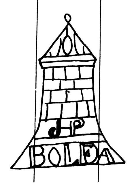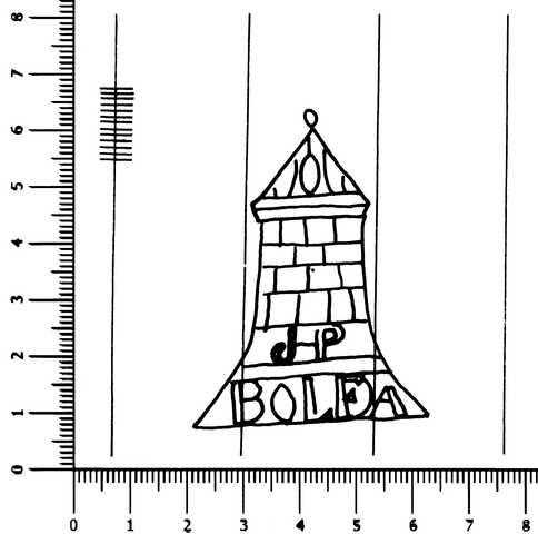 Tipo de filigrana: Sencilla Parte estudiada: Toda la filigrana Código del Motivo: K.02.01.01 Descripción: Torreón en la base JP/BOLEDA. Estructura: Tradicional de líneas Altura (mm): 56 Anchura (mm): 43 Tipo de papel: Verjurado Posición en la hoja: Derecha centro Nº de corondeles en la hoja: 19 Distancia entre corondeles: Situada entre el corondel 13 y el corondel 16 Posición en relación al texto: Origen de los datos: Datos obtenidos del original País de localizatión del molino: España Lugar del molino: Capellades, Barcelona. Fabricante: Josep Boleda Autor de los datos de este registro: María Dolores Díaz de Miranda Macías Tipo de uso: Papel para escribir Estado de la hoja: Sin cortar bordes Altura de la hoja: 313 Anchura de la hoja: 430 Color de la hoja: Natural Institución: Archivo Municipal de Oviedo.