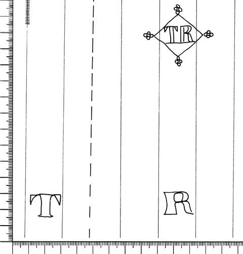 Tipo de filigrana: Doble Parte estudiada: Izquierda Código del Motivo: V.01.21.00 Descripción: Filigrana doble. Filigrana izquierda: inicial T. Filigrana derecha: rombo con las iniciales TR en su interior y a los pies de la hoja la inicial R. Estructura: Tradicional de líneas Altura (mm): 14 Anchura (mm): 19 Tipo de papel: Verjurado Posición en la hoja: Izquierda inferior Nº de corondeles en la hoja: 19 Distancia entre corondeles: Situada entre el corondel 4 y el corondel 5 Posición en relación al texto: Origen de los datos: Datos obtenidos del original País de localizatión del molino: España Lugar del molino: Capellades, Barcelona. Fabricante: Tomás Romaní Autor de los datos de este registro: María Dolores Díaz de Miranda Macías Tipo de uso: Papel sellado Estado de la hoja: Cortados todos los bordes Altura de la hoja: 313 Anchura de la hoja: 440 Color de la hoja: Natural Institución: Archivo Municipal de Oviedo.