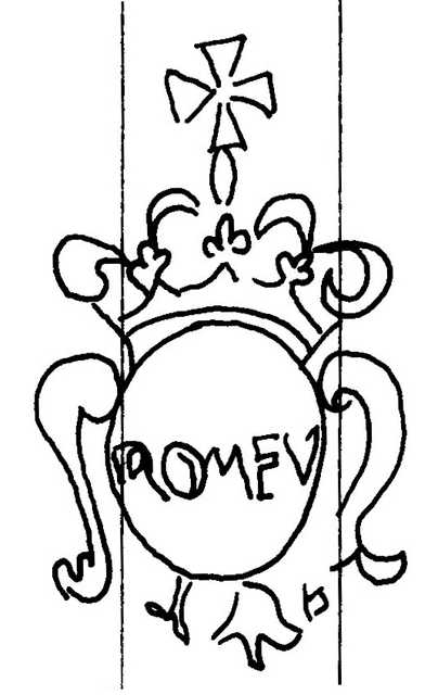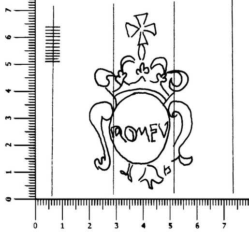 Tipo de filigrana: Sencilla Parte estudiada: Toda la filigrana Código del Motivo: T.02.17.00 Descripción: Escudo coronado con el apellido ROMEV en el interiror. Estructura: Tradicional de líneas Altura (mm): 65 Anchura (mm): 38 Tipo de papel: Verjurado Posición en la hoja: Derecha centro Nº de corondeles en la hoja: 19 Distancia entre corondeles: Situada entre el corondel 13 y el corondel 16 Posición en relación al texto: Origen de los datos: Datos obtenidos del original País de localizatión del molino: España Lugar del molino: Capellades, Barcelona. Fabricante: Jeromi Romeu Autor de los datos de este registro: María Dolores Díaz de Miranda Macías Tipo de uso: Papel sellado Estado de la hoja: Sin cortar bordes Altura de la hoja: 310 Anchura de la hoja: 420 Color de la hoja: Natural Institución: Archivo Municipal de Oviedo.