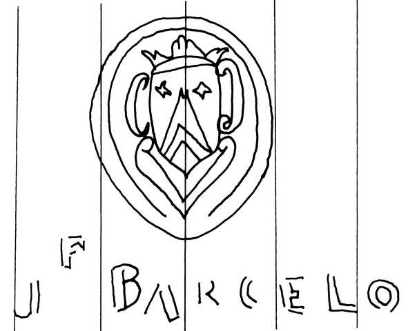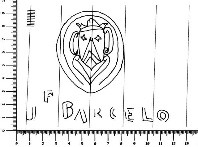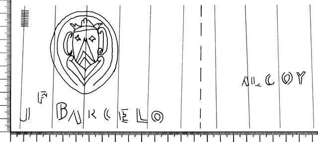 Tipo de filigrana: Doble Parte estudiada: Izquierda Código del Motivo: T.04.06.02 Descripción: Filigrana doble. Filigrana derecha: ALCOY. Filigrana izquierda: óvalo con el escudo de la Merced, en la base JF Barceló. Estructura: Tradicional de líneas Altura (mm): 86 Anchura (mm): 105 Tipo de papel: Verjurado Posición en la hoja: Izquierda centro Nº de corondeles en la hoja: 19 Distancia entre corondeles: Situada entre el corondel 3 y el corondel 8 Posición en relación al texto: Origen de los datos: Datos obtenidos del original País de localizatión del molino: España Lugar del molino: Alcoy, Alicante. Fabricante: José Barceló Autor de los datos de este registro: María Dolores Díaz de Miranda Macías Tipo de uso: Papel sellado Estado de la hoja: Sin cortar bordes Altura de la hoja: 315 Anchura de la hoja: 436 Color de la hoja: Natural Institución: Archivo Municipal de Oviedo.