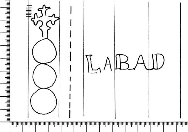 Tipo de filigrana: Doble Parte estudiada: Izquierda Código del Motivo: U.03.03.10 Descripción: Filigrana izquierda: tres círculos. Filigrana derecha: LABAD. Estructura: Tradicional de líneas Altura (mm): 86 Anchura (mm): 22 Tipo de papel: Verjurado Posición en la hoja: Izquierda centro Nº de corondeles en la hoja: 18 Distancia entre corondeles: Situada entre el corondel 3 y el corondel 4 Posición en relación al texto: Origen de los datos: Datos obtenidos del original País de localizatión del molino: España Lugar del molino: Alcoy, Alicante. Fabricante: Lorenzo Abad Autor de los datos de este registro: María Dolores Díaz de Miranda Macías Tipo de uso: Papel sellado Estado de la hoja: Cortado borde izquierdo Altura de la hoja: 302 Anchura de la hoja: 342 Color de la hoja: Natural Institución: Archivo Municipal de Oviedo.