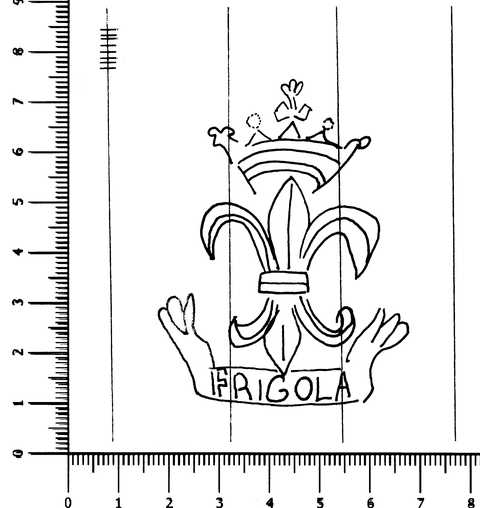Tipo de filigrana: Sencilla Parte estudiada: Toda la filigrana Código del Motivo: T.01.02.00 Descripción: Flor de lis coronada, en la base FRIGOLA. Estructura: Tradicional de líneas Altura (mm): 65 Anchura (mm): 50 Tipo de papel: Verjurado Posición en la hoja: Izquierda centro Nº de corondeles en la hoja: 19 Distancia entre corondeles: Situada entre el corondel 4 y el corondel 7 Posición en relación al texto: Origen de los datos: Datos obtenidos del original País de localizatión del molino: España Lugar del molino: Borgonyà, Barcelona o Cornellà de Terri, Gerona o Santa María de Palautordera, Barcelona. Fabricante: Frigola Autor de los datos de este registro: María Dolores Díaz de Miranda Macías Tipo de uso: Papel sellado Estado de la hoja: Sin cortar bordes Altura de la hoja: 307 Anchura de la hoja: 430 Color de la hoja: Natural Institución: Archivo Municipal de Oviedo.