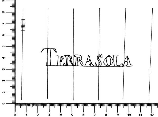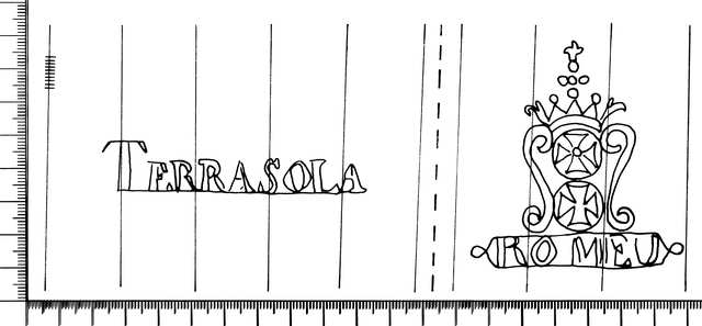 Tipo de filigrana: Doble Parte estudiada: Izquierda Código del Motivo: W.03.00.00 Descripción: Filigrana doble. Filigrana izquierda la palabra TERRASOLA. Filigrana derecha: escudo con corona sobremontada por una cruz y en cuyo interior dos cruces griegas, inscrita cada una en un círculo, en la base el nombre de RUMEV. Estructura: Tradicional de líneas Altura (mm): 16 Anchura (mm): 80 Tipo de papel: Verjurado Posición en la hoja: Izquierda centro Nº de corondeles en la hoja: 19 Distancia entre corondeles: Situada entre el corondel 3 y el corondel 8 Posición en relación al texto: Origen de los datos: Datos obtenidos del original País de localizatión del molino: España Lugar del molino: Terrasola, Barcelona. Fabricante: Romeu Autor de los datos de este registro: María Dolores Díaz de Miranda Macías Tipo de uso: Papel sellado Estado de la hoja: Sin cortar bordes Altura de la hoja: 310 Anchura de la hoja: 426 Color de la hoja: Natural Institución: Archivo Municipal de Oviedo.