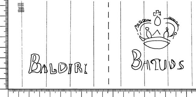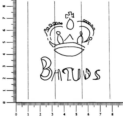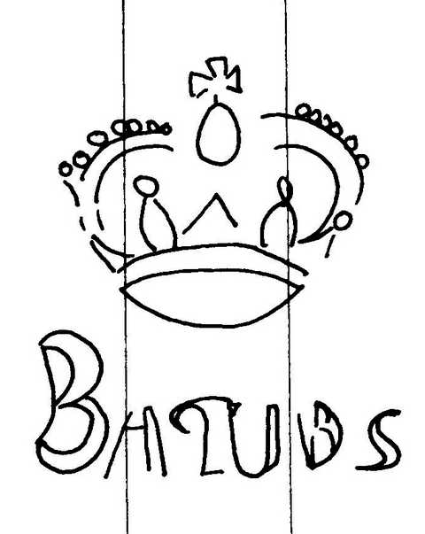 Tipo de filigrana: Doble Parte estudiada: Derecha Código del Motivo: R.02.01.00 Descripción: Filigrana doble: Filigrana izquierda: BALDIRI. Filigrana derecha: Corona en la base BAQUES. Estructura: Tradicional de líneas Altura (mm): 58 Anchura (mm): 50 Tipo de papel: Verjurado Posición en la hoja: Derecha centro Nº de corondeles en la hoja: 19 Distancia entre corondeles: Situada entre el corondel 13 y el corondel 16 Posición en relación al texto: Origen de los datos: Datos obtenidos del original País de localizatión del molino: España Lugar del molino: Sant Sadurní de Noia, Barcelona. Fabricante: Baldiri Baqués Autor de los datos de este registro: María Dolores Díaz de Miranda Macías Tipo de uso: Papel sellado Estado de la hoja: Sin cortar bordes Altura de la hoja: 310 Anchura de la hoja: 420 Color de la hoja: Natural Institución: Archivo Municipal de Oviedo.