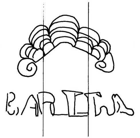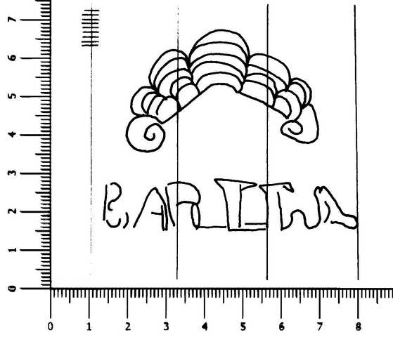 Tipo de filigrana: Sencilla Parte estudiada: Toda la filigrana Código del Motivo: W.02.02.00 Descripción: Medio círculo a modo de corona en la base BARILA. Estructura: Tradicional de líneas Altura (mm): 53 Anchura (mm): 66 Tipo de papel: Verjurado Posición en la hoja: Izquierda centro Nº de corondeles en la hoja: 19 Distancia entre corondeles: Situada entre el corondel 3 y el corondel 6 Posición en relación al texto: Origen de los datos: Datos obtenidos del original País de localizatión del molino: España Lugar del molino: Cataluña ? Fabricante: Barila? Autor de los datos de este registro: María Dolores Díaz de Miranda Macías Tipo de uso: Papel sellado Estado de la hoja: Cortado borde izquierdo y superior Altura de la hoja: 309 Anchura de la hoja: 216 Color de la hoja: Natural Institución: Archivo Municipal de Oviedo.