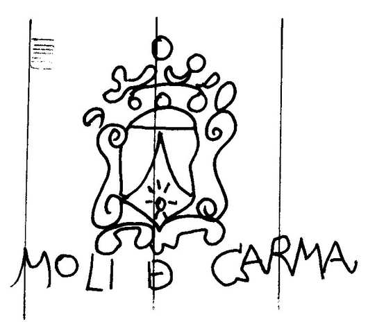 Tipo de filigrana: Sencilla Parte estudiada: Toda la filigrana Código del Motivo: T.04.06.02 Descripción: Escudo del Carme en la base las letras MOLI D CARMA. Estructura: Tradicional de líneas Altura (mm): 45 Anchura (mm): 60 Tipo de papel: Verjurado Posición en la hoja: Distancia entre corondeles: Posición en relación al texto: Origen de los datos: Datos obtenidos de una repro Información adicional: Esta filigrana ha sido publicada por Oriol VALLS i SUBIRÁ, Paper and Watermarks in Catalonia. T. I-II. Amsterdam: The Paper Publications Society, 1970, filigrana nº 773. La imagen que se ofrece es un calco manual de la filigrana publicada y parte de los d País de localizatión del molino: España Lugar del molino: Capellades, Barcelona, Cataluña. Fabricante: Francesc Romaní. Autor de los datos de este registro: María Dolores Díaz de Miranda Macías Estado de la hoja: Altura de la hoja: Anchura de la hoja: Color de la hoja: Institución: Archivo del Museo-Molino Papelero, Capellades, Barcelona.