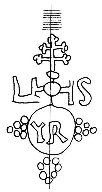 Tipo de filigrana: Sencilla Parte estudiada: Toda la filigrana Código del Motivo: U.01.02.00 Descripción: Círculo coronado por una cruz trilobulada; en el interior las iniciales YR. Estructura: Tradicional de líneas Altura (mm): 72 Anchura (mm): 43 Tipo de papel: Verjurado Posición en la hoja: Distancia entre corondeles: Posición en relación al texto: Origen de los datos: Datos obtenidos de una repro Información adicional: Esta filigrana ha sido publicada por Oriol VALLS i SUBIRÁ, Paper and Watermarks in Catalonia. T. I-II. Amsterdam: The Paper Publications Society, 1970, filigrana nº 793. La imagen que se ofrece es un calco manual de la filigrana publicada y parte de los d País de localizatión del molino: España Lugar del molino: Capellades, Barcelona, Cataluña Fabricante: Josep Romaní y Borrull. Autor de los datos de este registro: María Dolores Díaz de Miranda Macías Estado de la hoja: Altura de la hoja: Anchura de la hoja: Color de la hoja: Institución: Archivo Municipal de Manresa, Barcelona.