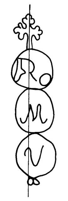 Tipo de filigrana: Sencilla Parte estudiada: Toda la filigrana Código del Motivo: U.03.03.10 Descripción: Tres círculos sobremontados por una cruz lobulada. En el superior las iniciales RO, en el del medio la M y en el inferior la V. Estructura: Tradicional de líneas Altura (mm): 70 Anchura (mm): 16 Tipo de papel: Verjurado Posición en la hoja: Distancia entre corondeles: Posición en relación al texto: Origen de los datos: Datos obtenidos de una repro Información adicional: Esta filigrana ha sido publicada por Oriol VALLS i SUBIRÁ, Paper and Watermarks in Catalonia. T. I-II. Amsterdam: The Paper Publications Society, 1970, filigrana nº 871. La imagen que se ofrece es un calco manual de la filigrana publicada y parte de los País de localizatión del molino: España Lugar del molino: Capellades, Barcelona, Cataluña Fabricante: Romeu. Autor de los datos de este registro: María Dolores Díaz de Miranda Macías Estado de la hoja: Altura de la hoja: Anchura de la hoja: Color de la hoja: Institución: Archivo del Museo-Molino Papelero, Capellades, Barcelona.