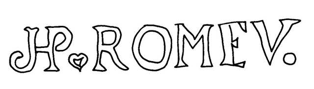 Tipo de filigrana: Sencilla Parte estudiada: Toda la filigrana Código del Motivo: W.04.02.00 Descripción: Letras J-P, pequeño corazón, ROMEV. Estructura: Tradicional de líneas Altura (mm): 15 Anchura (mm): 97 Tipo de papel: Vitela Posición en la hoja: Distancia entre corondeles: Posición en relación al texto: Origen de los datos: Datos obtenidos de una repro Información adicional: Esta filigrana ha sido publicada por Oriol VALLS i SUBIRÁ, Paper and Watermarks in Catalonia. T. I-II. Amsterdam: The Paper Publications Society, 1970, filigrana nº 877. La imagen que se ofrece es un calco manual de la filigrana publicada y parte de los d País de localizatión del molino: España Lugar del molino: Capellades, Barcelona, Cataluña Fabricante: Josep Romeu. Estado de la hoja: Altura de la hoja: Anchura de la hoja: Color de la hoja: Institución: Archivo del Museo-Molino Papelero, Capellades, Barcelona.