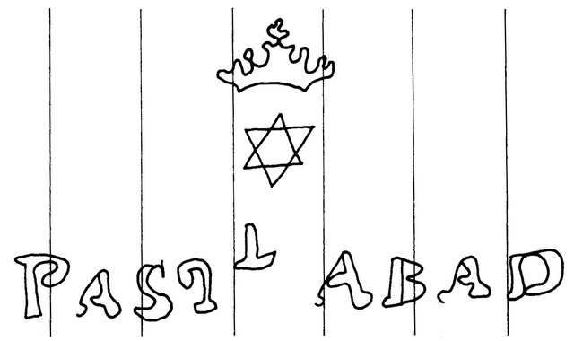 Tipo de filigrana: Sencilla Parte estudiada: Toda la filigrana Código del Motivo: S.99.00.00 Descripción: Estrella de David surmontada por una corona; en la base las letras PASqL ABAD. Estructura: Tradicional de líneas Altura (mm): 68 Anchura (mm): 125 Tipo de papel: Verjurado Posición en la hoja: Distancia entre corondeles: Posición en relación al texto: Origen de los datos: Datos obtenidos de una repro Información adicional: Esta filigrana ha sido publicada por Oriol VALLS i SUBIRÁ, Paper and Watermarks in Catalonia. T. I-II. Amsterdam: The Paper Publications Society, 1970, filigrana nº 1864. La imagen que se ofrece es un calco manual de la filigrana publicada y parte de los País de localizatión del molino: España Lugar del molino: Alcoy, Alicante. Fabricante: Pascual Abad. Estado de la hoja: Altura de la hoja: Anchura de la hoja: Color de la hoja: País de uso del papel: España