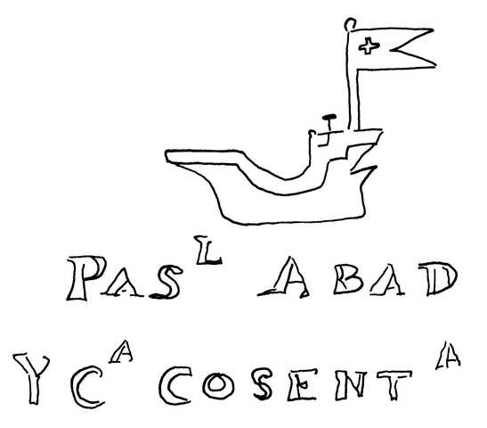 Tipo de filigrana: Sencilla Parte estudiada: Toda la filigrana Código del Motivo: L.03.00.00 Descripción: Carabela: en la base PASL ABAD Y CA CONSENTA. Estructura: Tradicional de líneas Altura (mm): 116 Anchura (mm): 130 Tipo de papel: Verjurado Posición en la hoja: Distancia entre corondeles: Posición en relación al texto: Origen de los datos: Datos obtenidos de una repro Información adicional: Esta filigrana ha sido publicada por Aldea (1997), filigrana nº 4. La imagen que se ofrece es un calco manual de la filigrana publicada y parte de los datos son resultado de su estudio. País de localizatión del molino: España Lugar del molino: Alcoy, Alicante. Fabricante: Pascual Abad. Estado de la hoja: Altura de la hoja: Anchura de la hoja: Color de la hoja: País de uso del papel: España