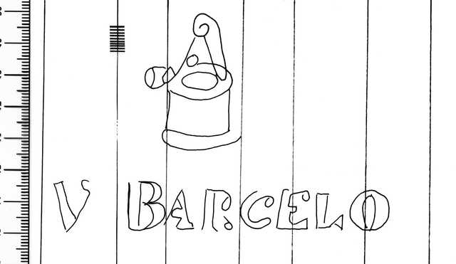Tipo de filigrana: Sencilla Parte estudiada: Toda la filigrana Código del Motivo: K.04.00.00 Descripción: Pozo; en la base V BARCELO. Estructura: Tradicional de líneas Altura (mm): 70 Anchura (mm): 106 Tipo de papel: Verjurado Posición en la hoja: Distancia entre corondeles: Posición en relación al texto: Origen de los datos: Datos obtenidos de una repro Información adicional: Esta filigrana ha sido publicada por Oriol VALLS i SUBIRÁ, Paper and Watermarks in Catalonia. T. I-II. Amsterdam: The Paper Publications Society, 1970, filigrana nº 84. La imagen que se ofrece es un calco manual de la filigrana publicada y parte de los da País de localizatión del molino: España Lugar del molino: Alcoy, Alicante. Fabricante: Vicente Barceló. Estado de la hoja: Altura de la hoja: Anchura de la hoja: Color de la hoja: País de uso del papel: España