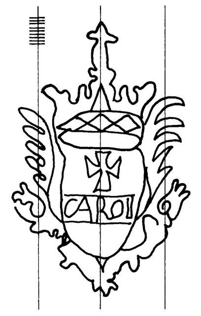 Tipo de filigrana: Sencilla Parte estudiada: Toda la filigrana Código del Motivo: T.02.15.01 Descripción: Escudo; en el interior una cruz latina sobre el apellido CAROL Estructura: Tradicional de líneas Altura (mm): 87 Anchura (mm): 56 Tipo de papel: Verjurado Posición en la hoja: Distancia entre corondeles: Posición en relación al texto: Origen de los datos: Datos obtenidos de una repro Información adicional: Esta filigrana ha sido publicada por Oriol VALLS i SUBIRÁ, Paper and Watermarks in Catalonia. T. I-II. Amsterdam: The Paper Publications Society, 1970, filigrana nº 198. La imagen que se ofrece es un calco manual de la filigrana publicada y parte de los País de localizatión del molino: España Fabricante: Carol. Estado de la hoja: Altura de la hoja: Anchura de la hoja: Color de la hoja: País de uso del papel: España