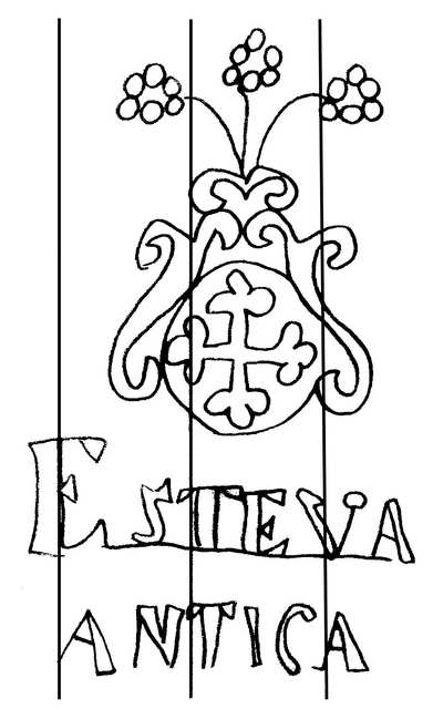 Tipo de filigrana: Sencilla Parte estudiada: Toda la filigrana Código del Motivo: T.02.15.05 Descripción: Círcul (emblema heráldico)o; en su interior una cruz lobulada, coronado por un ramillete de tres flores y en la base las palabras ESTEVA ANTICA. Estructura: Tradicional de líneas Altura (mm): 108 Anchura (mm): 65 Tipo de papel: Verjurado Posición en la hoja: Distancia entre corondeles: Posición en relación al texto: Origen de los datos: Datos obtenidos de una repro Información adicional: Esta filigrana ha sido publicada por Oriol VALLS i SUBIRÁ, Paper and Watermarks in Catalonia. T. I-II. Amsterdam: The Paper Publications Society, 1970, filigrana nº 48. La imagen que se ofrece es un calco manual de la filigrana publicada y parte de los d País de localizatión del molino: España Lugar del molino: Gerona, Cataluña Fabricante: Esteva Antiga. Estado de la hoja: Altura de la hoja: Anchura de la hoja: Color de la hoja: Institución: Archivo Diocesano de Vic, Cúria Fumada, Barcelona.