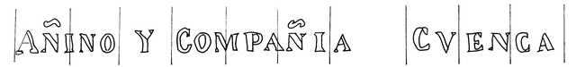 Tipo de filigrana: Doble Parte estudiada: Izquierda Código del Motivo: W.02.01.00 Descripción: Filigrana doble. Filigrana izquierda: Letras AÑINO Y COMPAÑIA. Filigrana derecha: CVENCA. Estructura: Tradicional de líneas Altura (mm): 16 Anchura (mm): 156 Tipo de papel: Verjurado Posición en la hoja: Distancia entre corondeles: Posición en relación al texto: Origen de los datos: Datos obtenidos de una repro Información adicional: GAYOSO, G. Historia del Papel en España. T. I-III. Lugo: Diputación Provincial, 1994,filigrana nº 37. La imagen que se ofrece es un calco manual de la filigrana publicada y parte de los datos son resultado de su estudio. País de localizatión del molino: España Lugar del molino: Cuenca. Fabricante: Añino y, probablemente, Grimaud. Estado de la hoja: Altura de la hoja: Anchura de la hoja: Color de la hoja: País de uso del papel: España