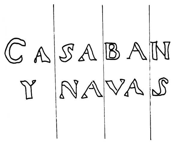 Tipo de filigrana: Doble Parte estudiada: Derecha Código del Motivo: W.02.01.00 Descripción: Filigrana doble: Filigrana izquierda: escudo coronado por una cruz; en el interior una flor de Lis. Filigrana drecha: letras CASABAN Y NAVAS. Estructura: Tradicional de líneas Altura (mm): 31 Anchura (mm): 84 Tipo de papel: Verjurado Posición en la hoja: Distancia entre corondeles: Posición en relación al texto: Origen de los datos: Datos obtenidos de una repro Información adicional: GAYOSO, G. Historia del Papel en España. T. I-III. Lugo: Diputación Provincial, 1994, filigrana nº 96. La imagen que se ofrece es un calco manual de la filigrana publicada y parte de los datos son resultado de su estudio. País de localizatión del molino: España Lugar del molino: Segovia. Fabricante: José Casaban y Navas. Estado de la hoja: Altura de la hoja: Anchura de la hoja: Color de la hoja: País de uso del papel: España