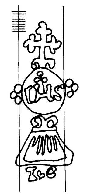 Tipo de filigrana: Sencilla Parte estudiada: Toda la filigrana Código del Motivo: S.15.01.02 Descripción: Relicario con custodia en el interior y las iniciales de JHS, coronado por cruz lobulada y en la base las iniciales I C. Estructura: Tradicional de líneas Altura (mm): 77 Anchura (mm): 34 Tipo de papel: Verjurado Posición en la hoja: Distancia entre corondeles: Posición en relación al texto: Origen de los datos: Datos obtenidos de una repro Información adicional: Esta filigrana ha sido publicada por Oriol VALLS i SUBIRÁ, Paper and Watermarks in Catalonia. T. I-II. Amsterdam: The Paper Publications Society, 1970, filigrana nº 278. La imagen que se ofrece es un calco manual de la filigrana publicada y parte de los País de localizatión del molino: España Lugar del molino: Comarca de l'Anoia, Barcelona, Cataluña Fabricante: I. Costas Estado de la hoja: Altura de la hoja: Anchura de la hoja: Color de la hoja: Signatura: Notaría de Olot, registro 1050.