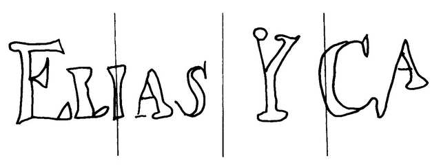 Tipo de filigrana: Sencilla Parte estudiada: Toda la filigrana Código del Motivo: W.02.01.00 Descripción: Letras ELIAS Y CA. Estructura: Tradicional de líneas Altura (mm): 24 Anchura (mm): 105 Tipo de papel: Verjurado Posición en la hoja: Distancia entre corondeles: Posición en relación al texto: Origen de los datos: Datos obtenidos de una repro Información adicional: Esta filigrana ha sido publicada por Oriol VALLS i SUBIRÁ, Paper and Watermarks in Catalonia. T. I-II. Amsterdam: The Paper Publications Society, 1970, filigrana nº 319. La imagen que se ofrece es un calco manual de la filigrana publicada y parte de los País de localizatión del molino: España Lugar del molino: Gélida, Barcelona, Cataluña Fabricante: Elías y Compañía. Estado de la hoja: Altura de la hoja: Anchura de la hoja: Color de la hoja: Institución: Archivo Municipal de Manresa, Barcelona.