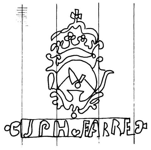 Tipo de filigrana: Sencilla Parte estudiada: Toda la filigrana Código del Motivo: T.02.10.07 Descripción: Escudo coronado; en el interior una fragua y en la base el nombre de JPH FARRE. Estructura: Tradicional de líneas Altura (mm): 73 Anchura (mm): 80 Tipo de papel: Verjurado Posición en la hoja: Distancia entre corondeles: Posición en relación al texto: Origen de los datos: Datos obtenidos de una repro Información adicional: Esta filigrana ha sido publicada por Oriol VALLS i SUBIRÁ, Paper and Watermarks in Catalonia. T. I-II. Amsterdam: The Paper Publications Society, 1970, filigrana nº 371. La imagen que se ofrece es un calco manual de la filigrana publicada y parte de los País de localizatión del molino: España Lugar del molino: Comarca de l'Anoia, Barcelona, Cataluña Fabricante: Josep Farrer i Macià. Estado de la hoja: Altura de la hoja: Anchura de la hoja: Color de la hoja: Institución: Archivo Histórico de la Ciudad de Barcelona.